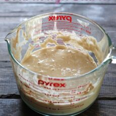 • The consistency will now resemble a thick pancake batter and there may be a few bubbles. With a clean spoon, remove and throw away about half the starter, about 1/2 cup (120 grams).
