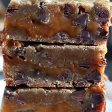 These bars are my new addiction. They sandwich chocolate chip cookie dough (which is already pretty much the greatest thing on the planet) with heavenly slightly salty caramel.