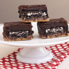 - Pour all of the brownie batter on top of Oreo layer and spread evenly with a spatula. Bake for 30-35 minutes, or until a knife comes out mostly clean when inserted into the middle of brownies. Serve warm (will be messy) or let cool completely and cut into 16 bars.