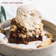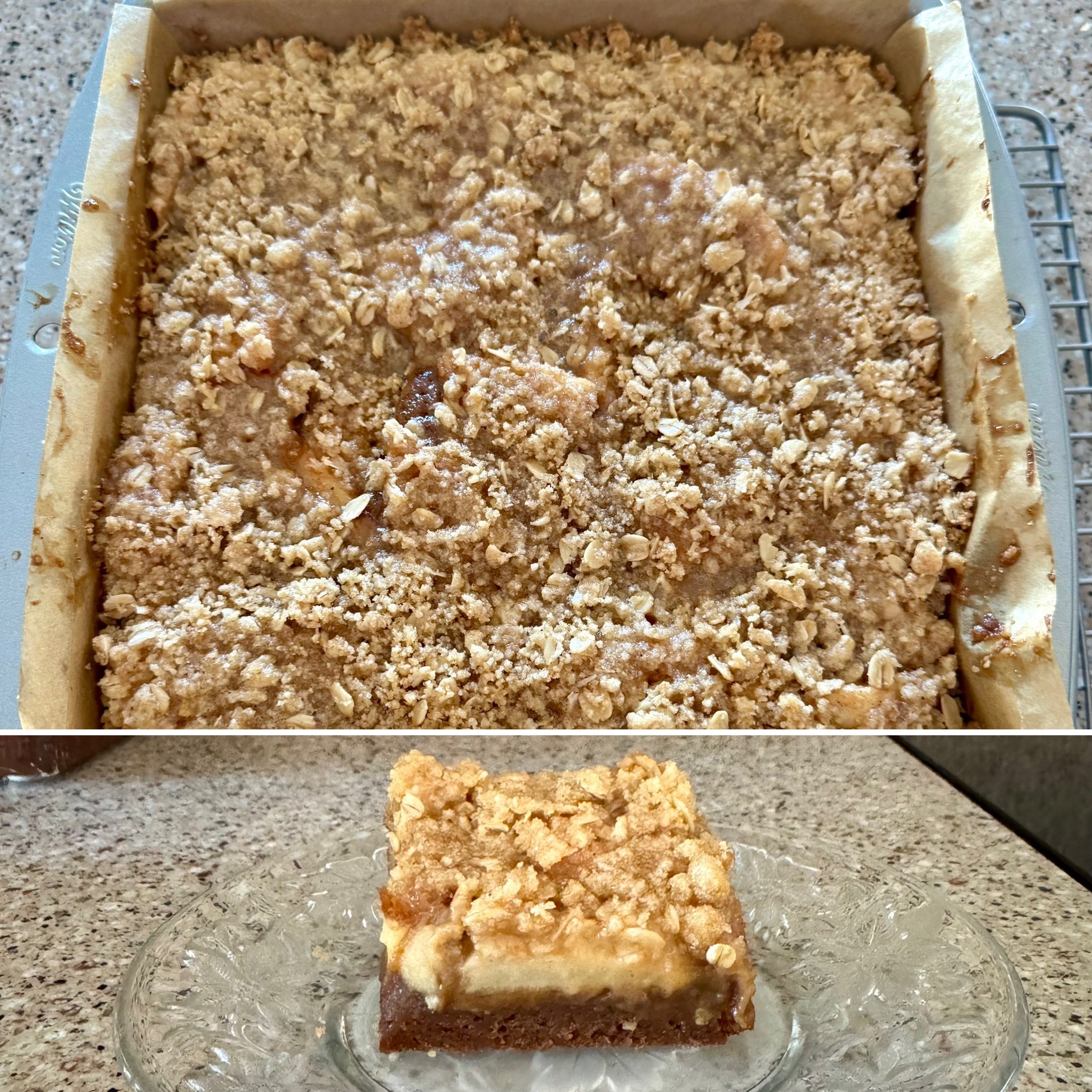 a square of apple crisp cookie bar with vanilla bean ice cream on top