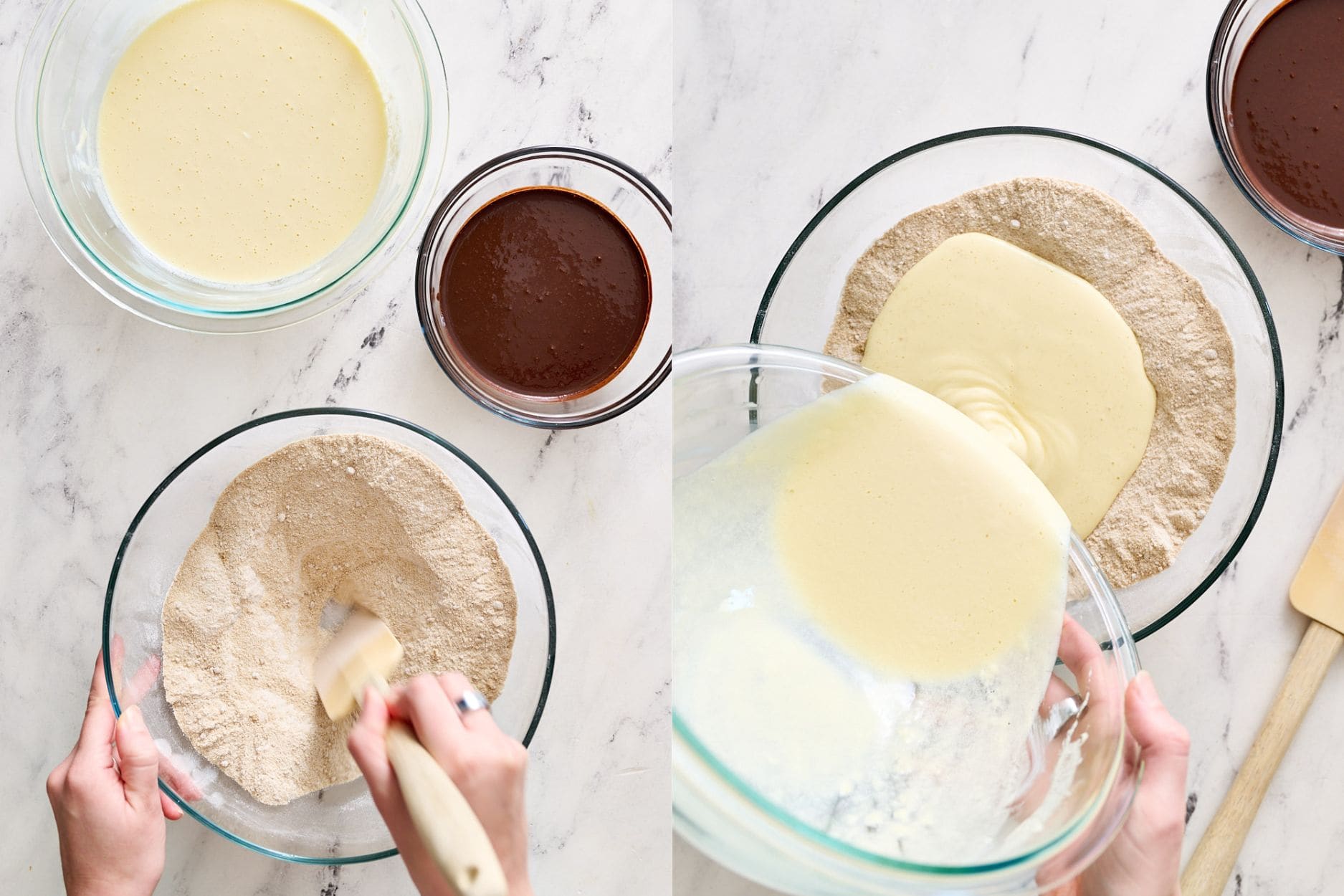 Create a well in the dry ingredients and pour in the wet mixture. Mix gently from the center outward until mostly combined. Avoid overmixing, which can cause “tunnels” in your baked cake or make the final texture rubbery.