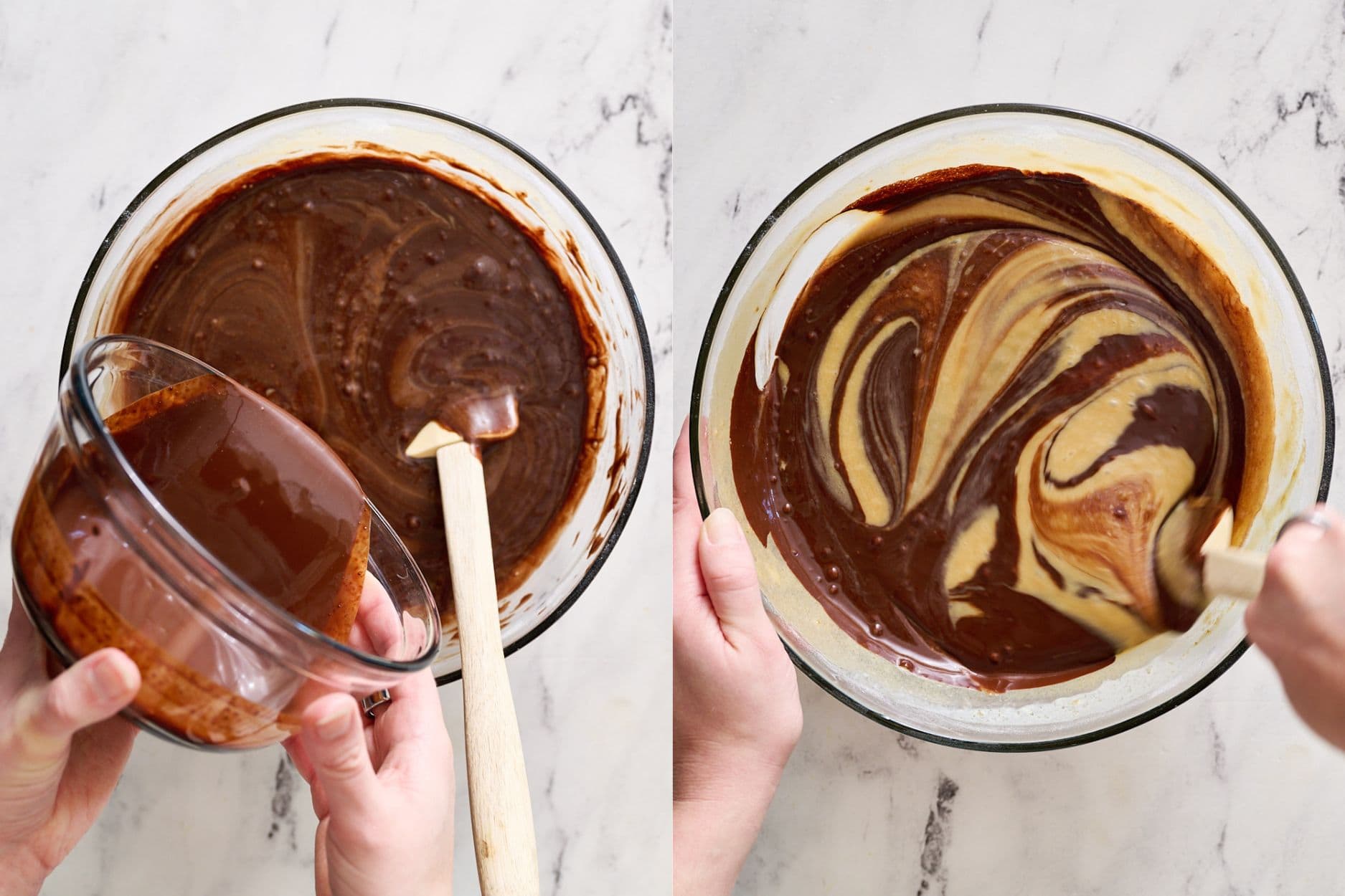 - Add the cooled cocoa mixture and whisk until the batter is smooth and evenly combined.