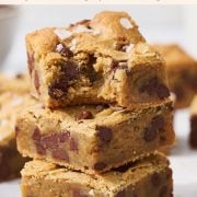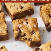 You can store the Blondies for up to 3 days at room temperature or up to a week in the fridge. If storing for more than a day, wait to slice into bars until you’re ready to serve to prevent stale edges.