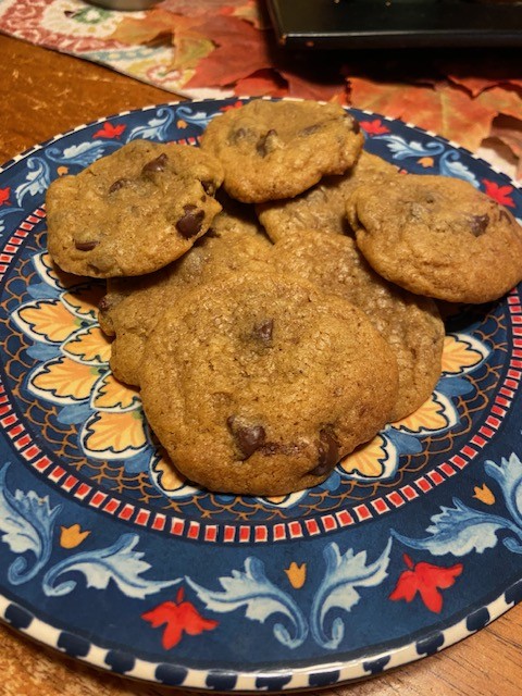 Unbeknownst to me, my granddaughters changed the rules for Tessa Cookie Day (it’s a real; thing chez nous!): for any cookie that has “add-ins” (and they only choose cookies with add-ins), they get to veto, augment, and/or substitute. For this cookie, they decided that chopped pecans and some kind of Heath Bar toffee bits would replace chocolate chips inside the cookie, and that each of us could choose something to add on top. I chose pecans, older granddaughter chose chocolate chips, and younger granddaughter chose nothing (because her older sister stole her choice.) What absolutely delicious cookies these are! (Younger granddaughter took the picture because: she knows how, and: I don’t know anything. But I’m learning!)