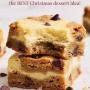 These bars are the perfect bake if you’re new to cheesecake. No water baths or special pans needed, and even if your cheesecake cracks a little, no one will know because there’s cookie dough on top!