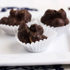 - Pour the nuts into the chocolate and stir to combine. Using a tablespoon, scoop spoonfuls of the chocolate-nut mixture onto a silicone baking mat.