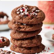 Chocolate Peppermint Cookies feature a decadent mint chocolate cookie base with chocolate chips throughout, topped with crushed candy canes, for the perfect Christmas cookie. These easy cookies are ready in just 35 minutes and taste like a mug of hot cocoa on a cozy winter night.