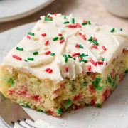 It’s the most wonderful time of the year… to bake Christmas Funfetti Sheet Cake with Cream Cheese Frosting and festive sprinkles!