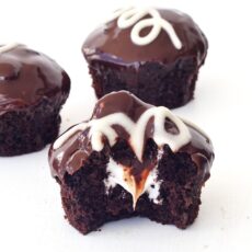 Hi friends! Jess here from Sweetest Menu, ready to share another delicious recipe with you. You might remember last month I shared my recipe for Nutella Stuffed Chocolate Whoopie Pies. Well today I have another chocolatey treat for you – Homemade Hostess Ding Dong Cupcakes! Soft and fluffy chocolate cakes that are filled with a light and creamy marshmallow filling and topped with gooey chocolate ganache. And of course, they have the final signature Hostess Cupcake swirl made with a simple vanilla buttercream. This is one heavenly cupcake!