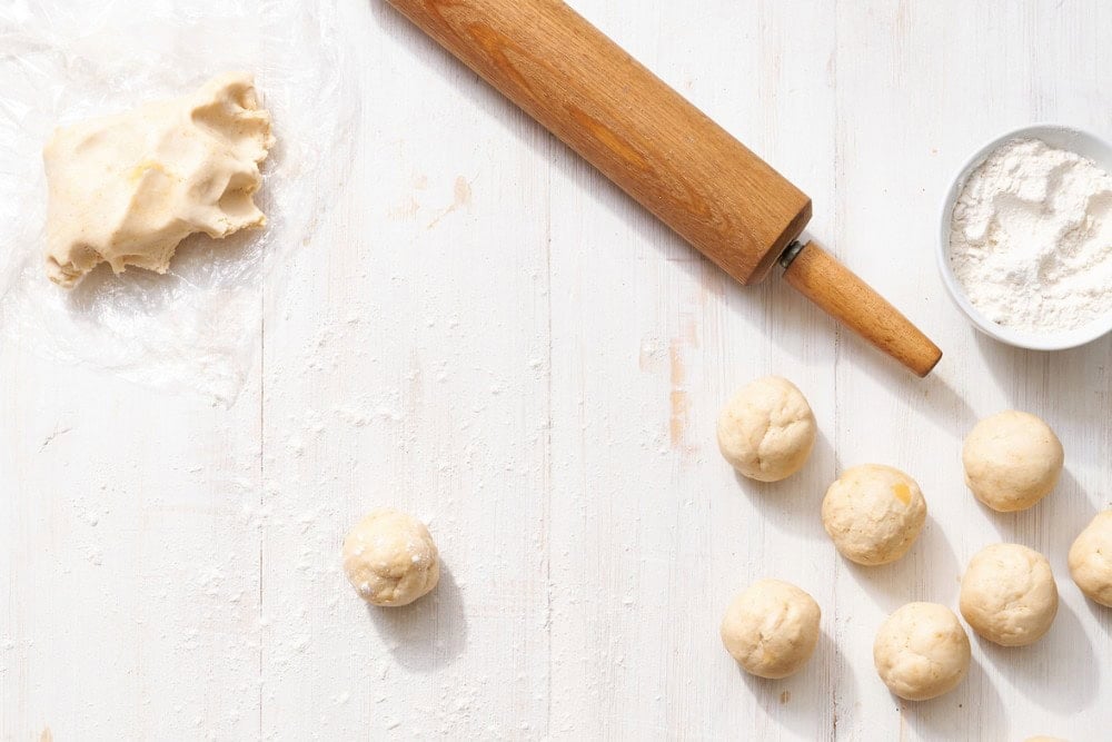 Separate dough.Tear off golf-ball sized pieces of chilled dough and roll into balls.