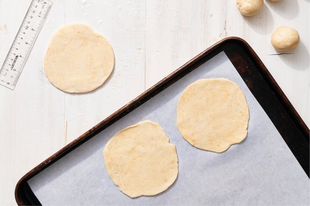 Roll dough. On a lightly floured surface, use a rolling pin to roll out the balls into 1/4-inch thick, 5-inch diameter circles.
