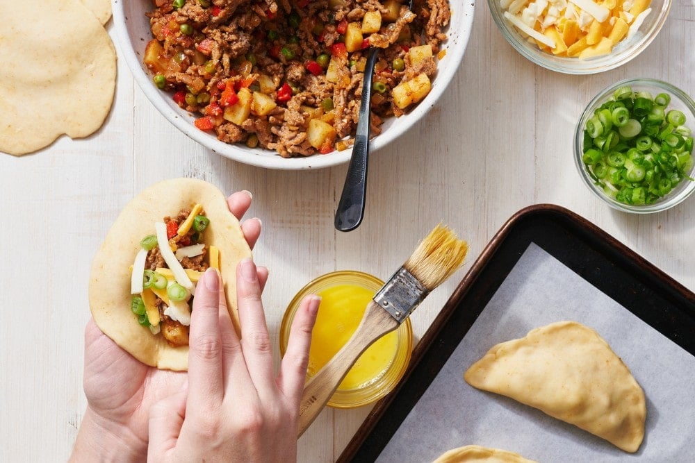 - Tear off golf-ball sized pieces of the chilled dough and roll into balls. On a lightly floured work surface, use a rolling pin to roll out the balls into 1/4-inch thick, 5-inch diameter circles. Once your dough has been rolled out, place 2 heaping tablespoons of filling in the center of each dough circle. Add ½ teaspoon scallions to each circle, and sprinkle lightly with cheese, if using. Brush a small amount of egg wash lightly over one half edge’s border. Fold over the dough to create a half-moon shape and press edges firmly to seal. Crimp edges with the back of a fork.