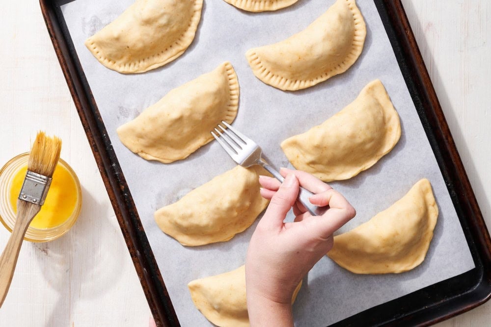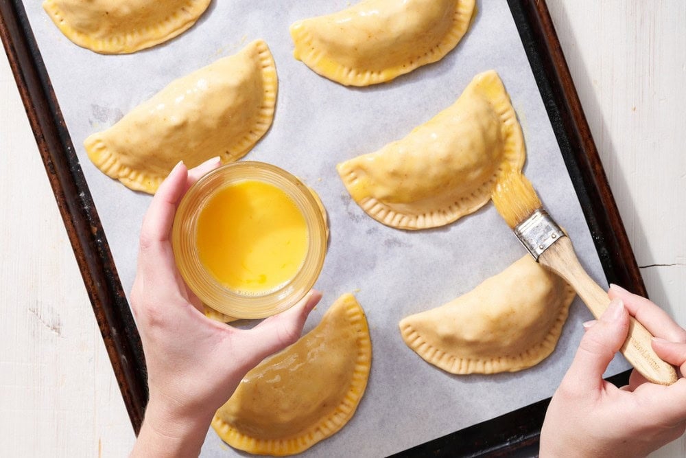 - Place empanadas onto the prepared baking sheet. Lightly beat together the egg and water. Brush the empanadas gently with the egg wash.
