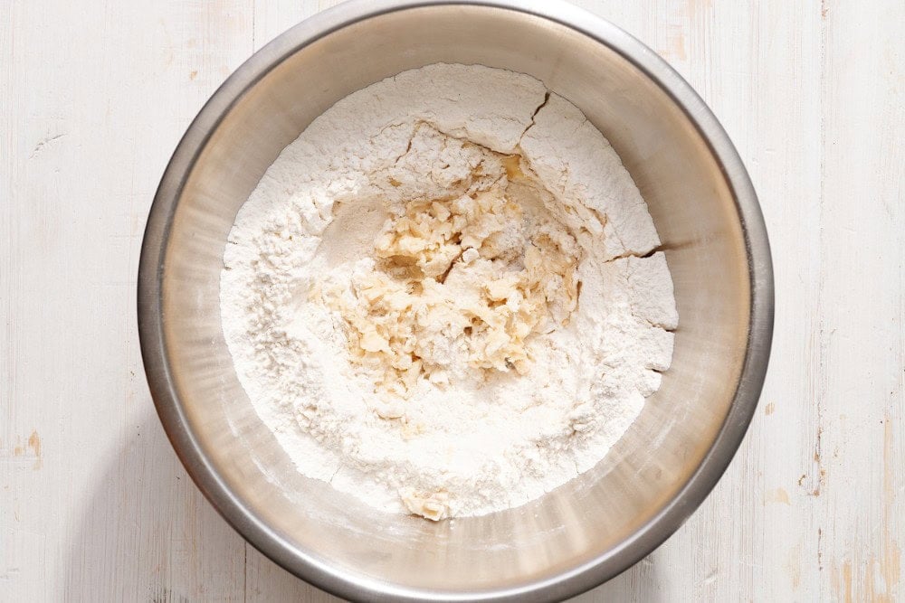 Mix. Work the dough until flour mixture is combined. Dough will feel greasy and may have visible streaks of butter. Don’t add more flour!