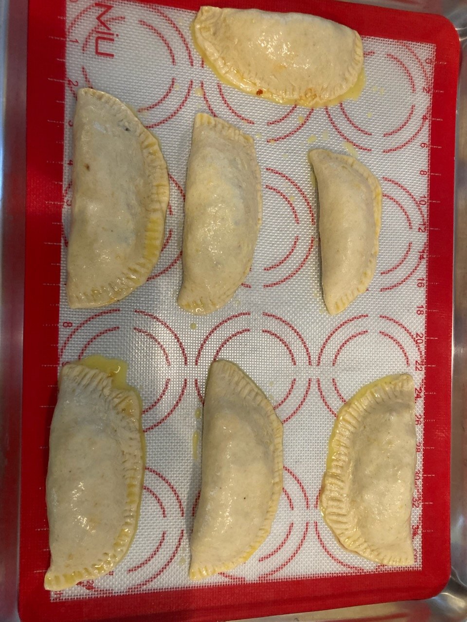 - Place empanadas onto the prepared baking sheet. Lightly beat together the egg and water. Brush the empanadas gently with the egg wash.