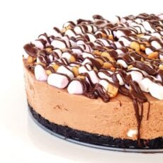 - When you are ready to serve, scatter the remaining 1/2 cup (35 grams) of roasted peanuts and 1 cup (55 grams) of mini marshmallows and lightly press them into the top of the cheesecake. Melt your extra chocolate in the microwave and then use a spoon to drizzle the melted chocolate all over the cheesecake. Cut and serve!