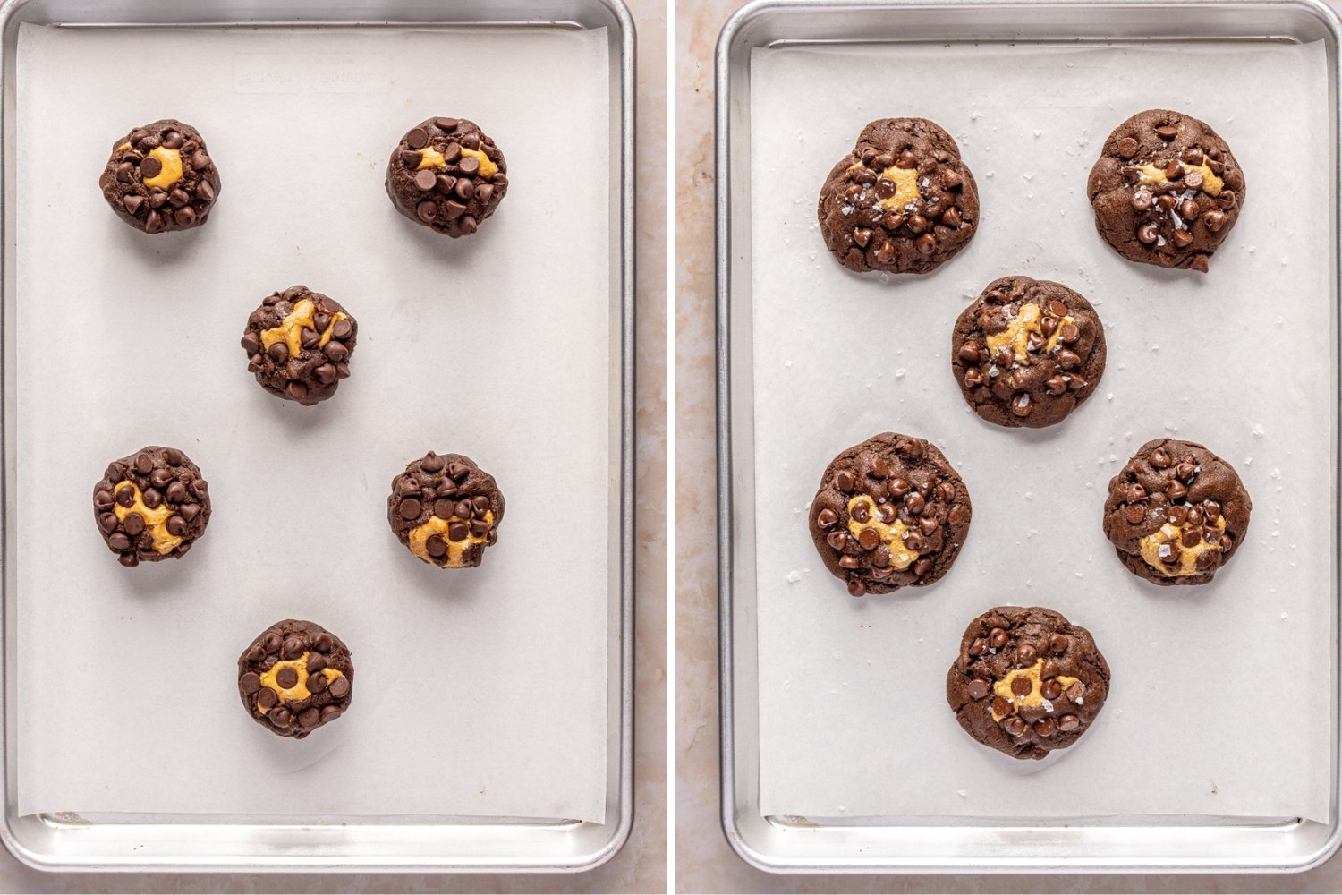 - Using a large spring-loaded scoop, drop 3-tablespoon balls of dough onto a parchment lined baking sheet. Flatten each ball of dough and place a peanut butter ball in the center. Cover in the dough, leaving some peanut butter peaking out. Flatten slightly. Dot generously (more than you think!) with additional chocolate chips.