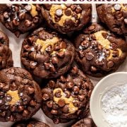 - Using a large spring-loaded scoop, drop 3-tablespoon balls of dough onto a parchment lined baking sheet. Flatten each ball of dough and place a peanut butter ball in the center. Cover in the dough, leaving some peanut butter peaking out. Flatten slightly. Dot generously (more than you think!) with additional chocolate chips.