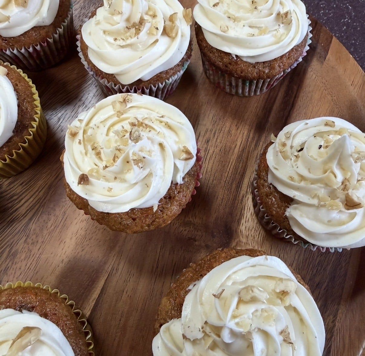 - Frost cupcakes and decorate with remaining chopped walnuts, if desired. Serve immediately or store in an airtight container in the fridge for up to 2 days.