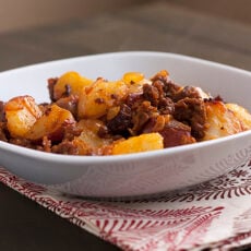This is Mexican comfort food at its finest – easy, fast, rich, and spicy. Throw in a tortilla or some eggs, maybe some cheese or beans, and you have breakfast, lunch, or dinner. Seriously. By the way, that is real steam coming off the dish in the photograph above! I wasn’t about to let this dish get cold before eating it just for the sake of a photo.