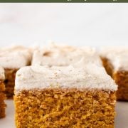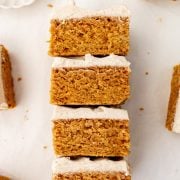 Yes! Freeze frosted sliced Pumpkin Bars in a single layer or as a full slab inside an airtight container for up to one month. Thaw in the fridge overnight, then bring to room temperature before serving.