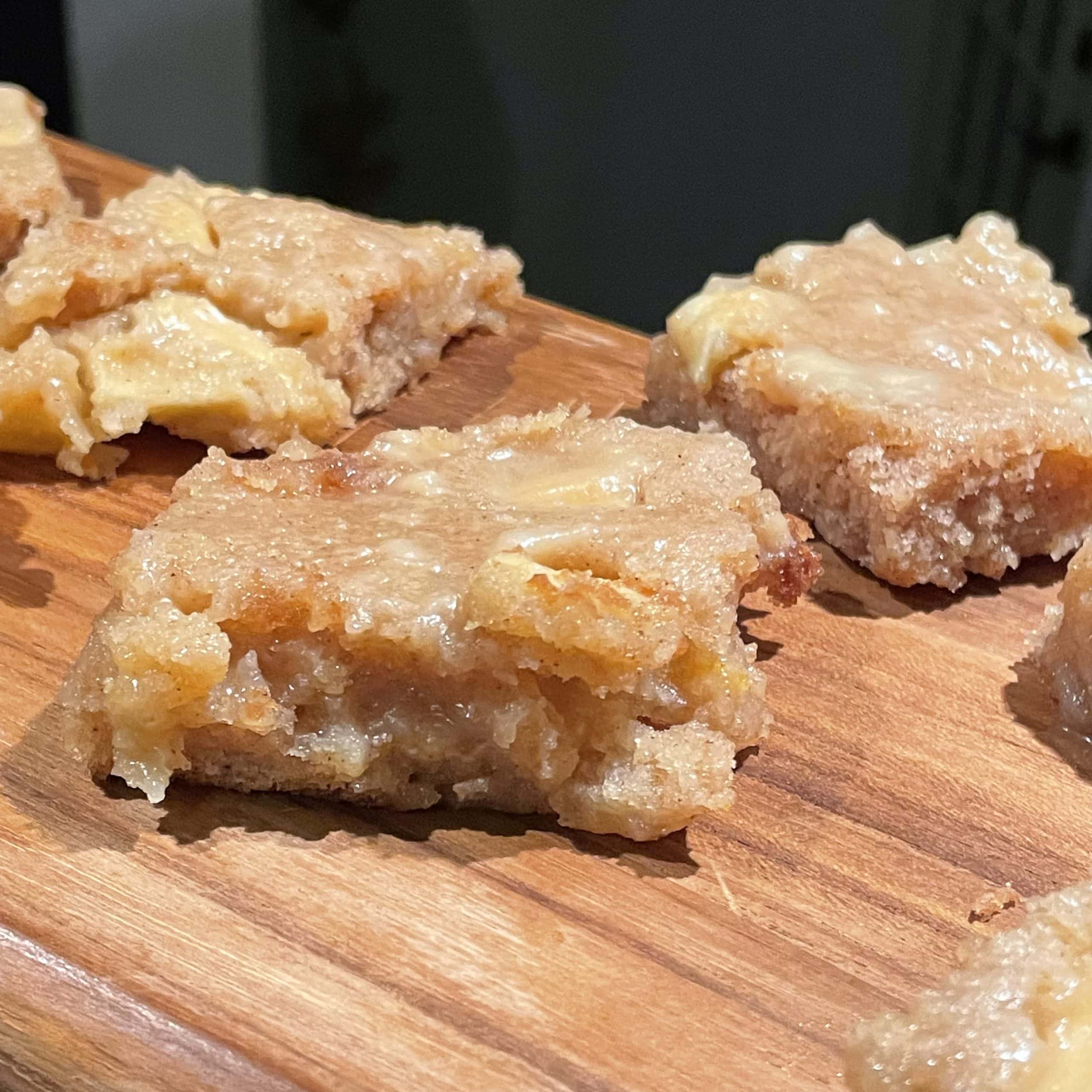 a slice of salted caramel apple sheet cake on a plate