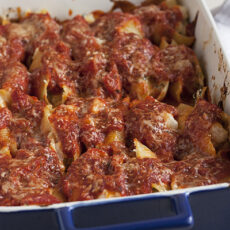 It will be strange to not be studying cooking terms, definitions, and actions. I’m just glad I have this blog to explore new things in the kitchen. Like these Shrimp-Stuffed Shells. I would have never thought to use seafood in a cheesy pasta dish like this but somehow, it works.