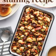 Between delicious side dishes like this stuffing, my Cheesy Green Bean Casserole with Bacon, delicious Sweet Potato Casserole, and soft Ultimate Dinner Rolls, I don’t even need the turkey!