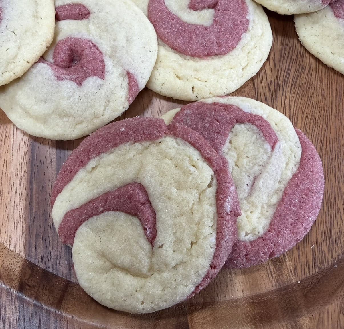 I made these after reading a book with a strawberry festival. Texture is a soft cookie, deliciously sweet. Great with a hot cuppa. I can appreciate rolling each one onto a swirl; time consuming as strawberry dough is a little stiffer and often cracked for me. Have you tried rolling out 2rectangles and rolling together (much like a sushi roll) and then slicing? Potentially creating a smaller cookie too (my cookies were runaway giants). But delicious and easy to share.