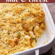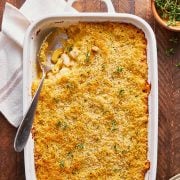 If you’re planning on serving this to company, cook the pasta noodles but shave a minute or two off the normal boiling time to leave them very al dente. Make the sauce as the recipe directs and let it cool completely. Toss the noodles in the sauce and place in the casserole dish as directed. Cover tightly and refrigerate for up to 2 days. Pull directly from the fridge and proceed with the recipe as written, topping with the Panko mixture and baking, adding a minute or two to the cooking time.